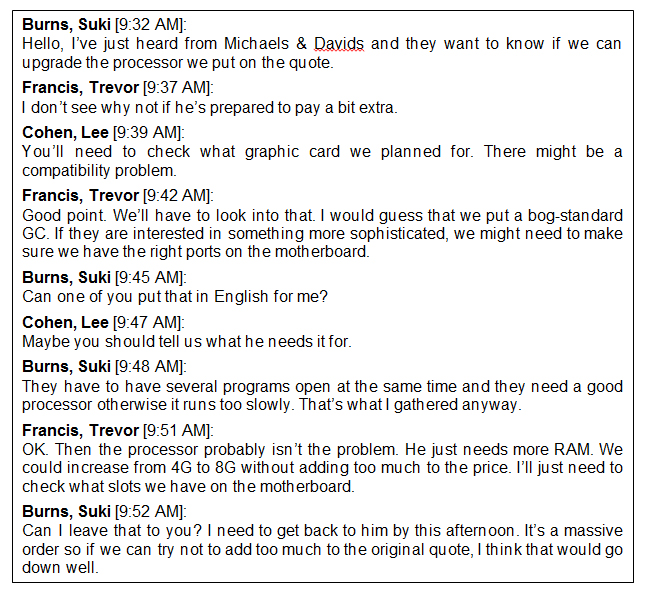 Suki Burns is not a technical expert. She explains the problem that her customer has, but she is not sure she understood exactly.
